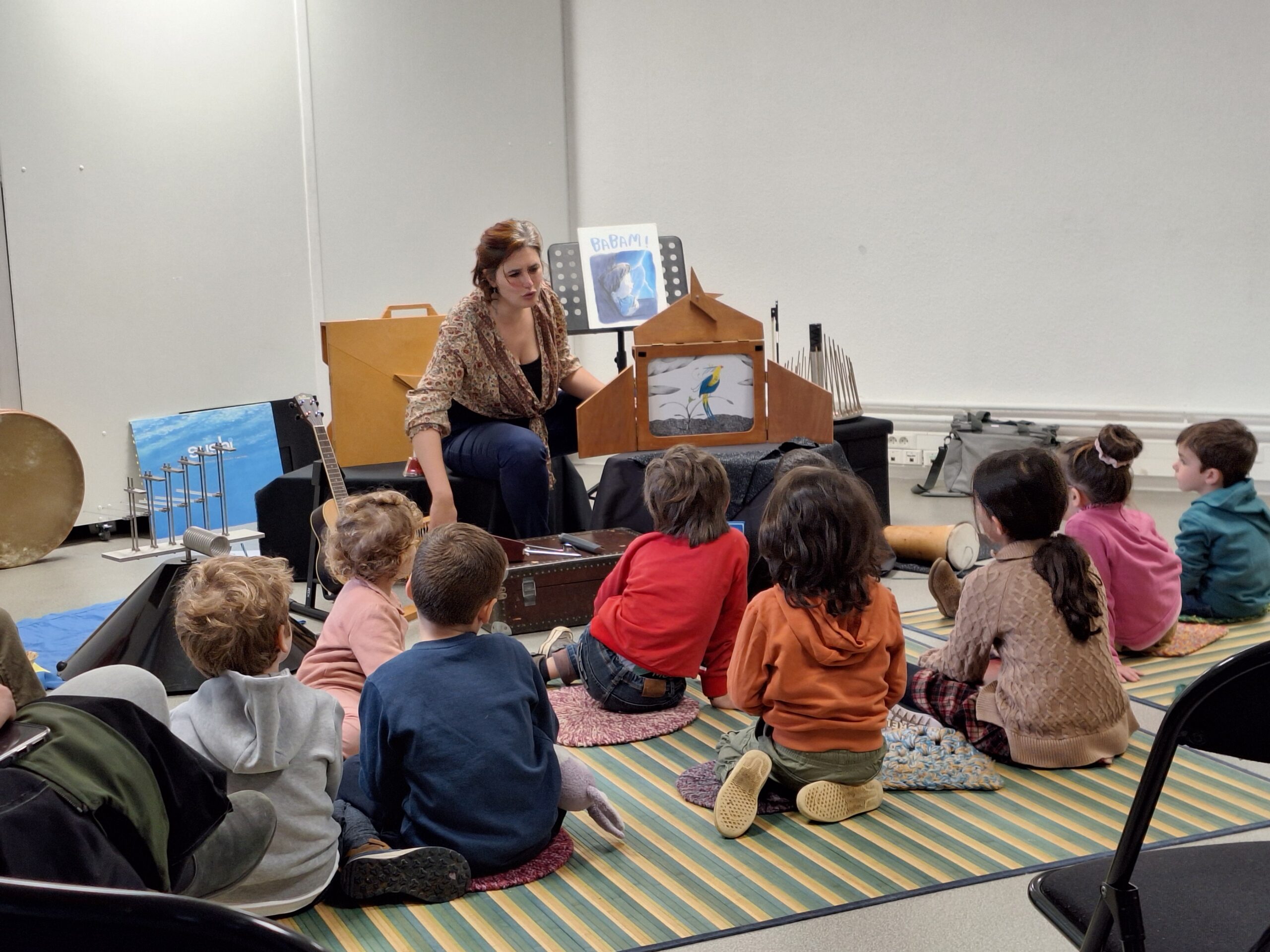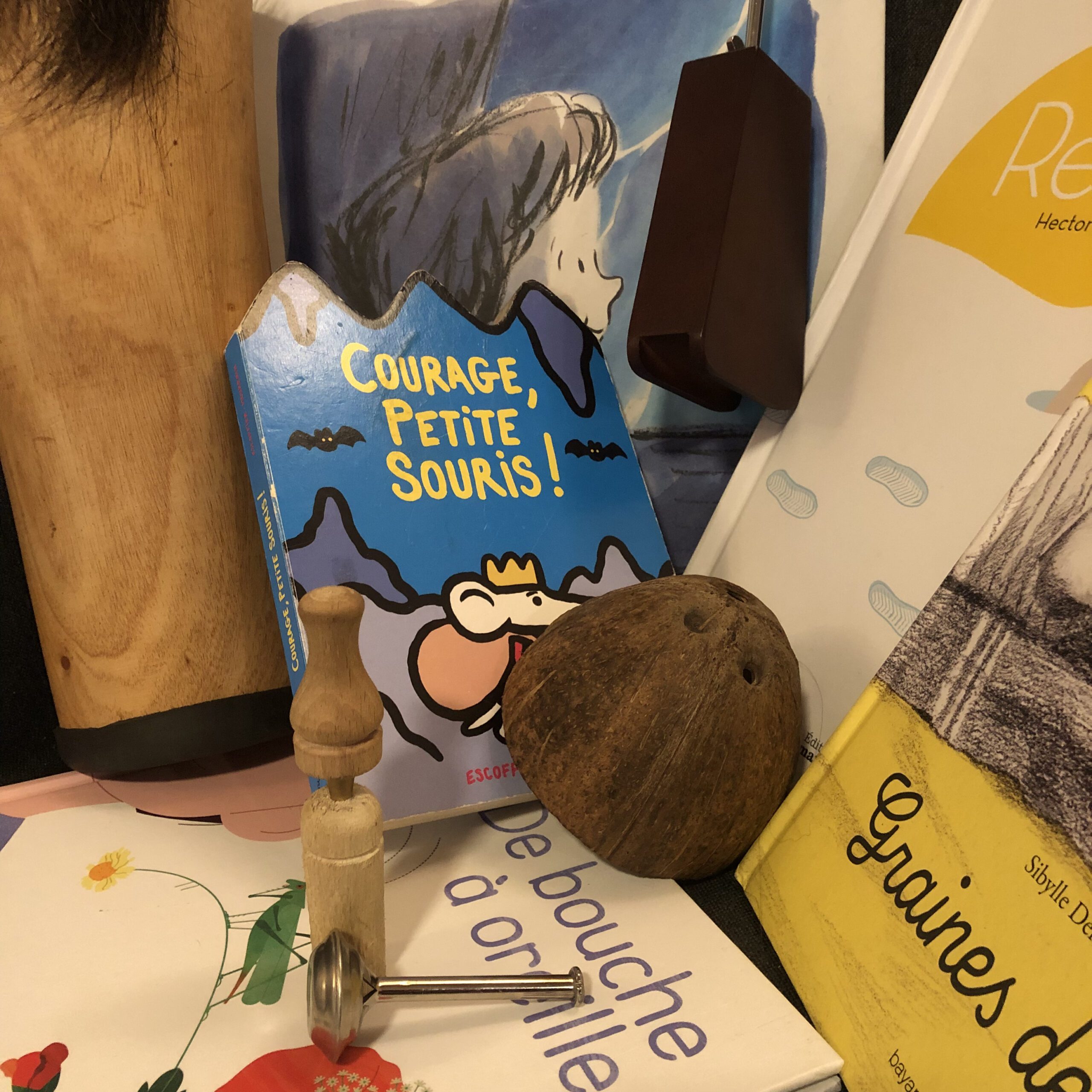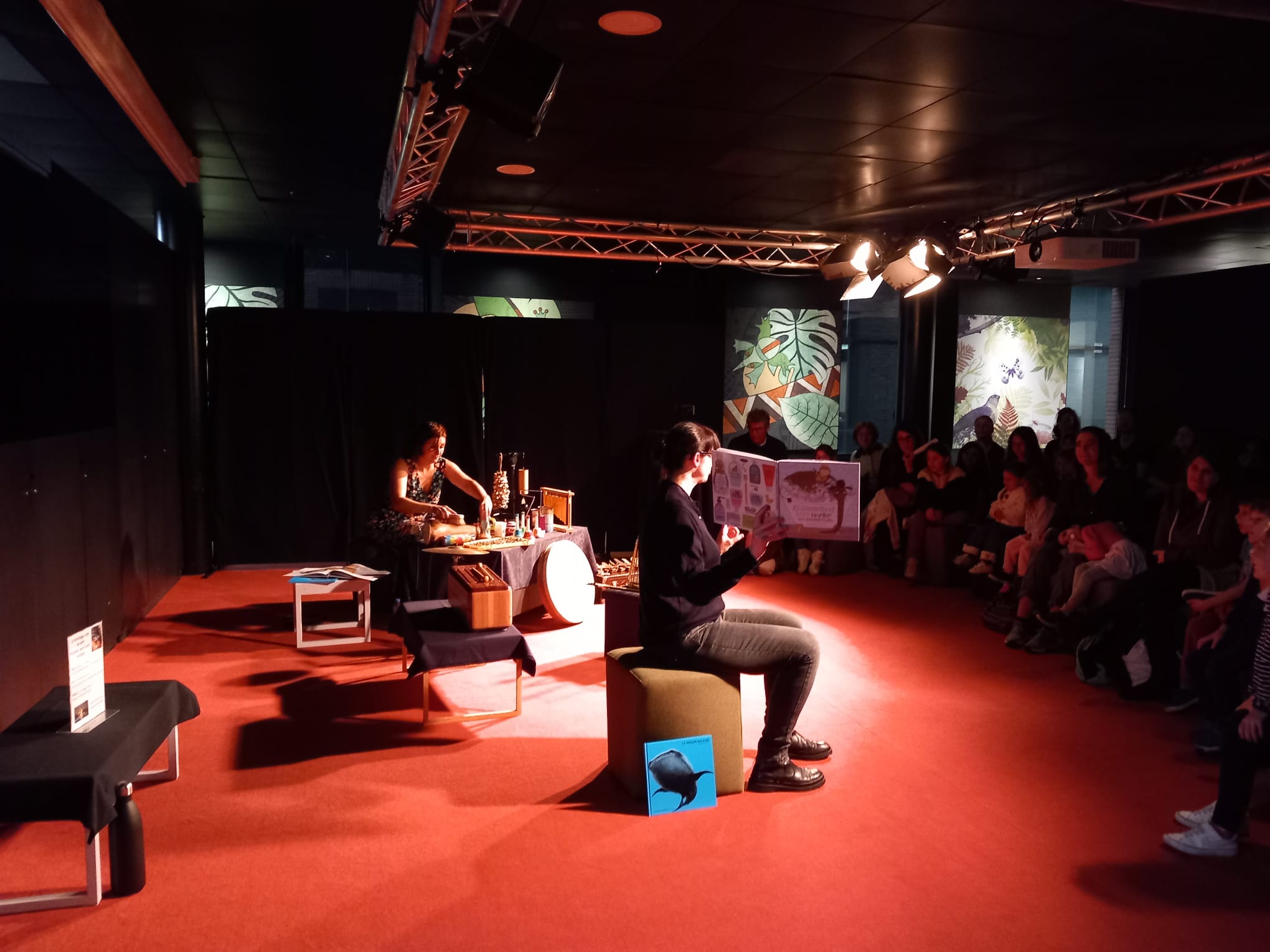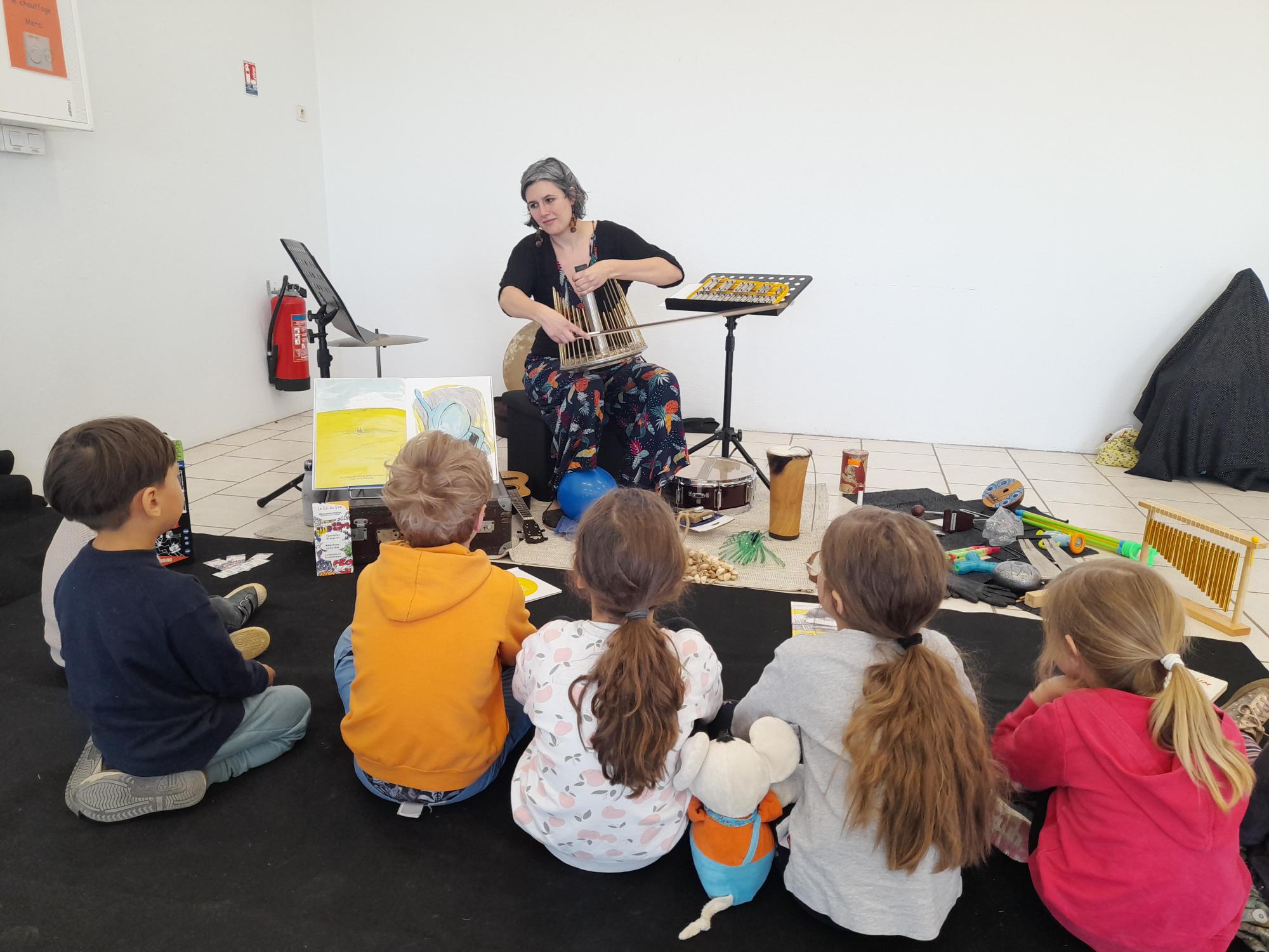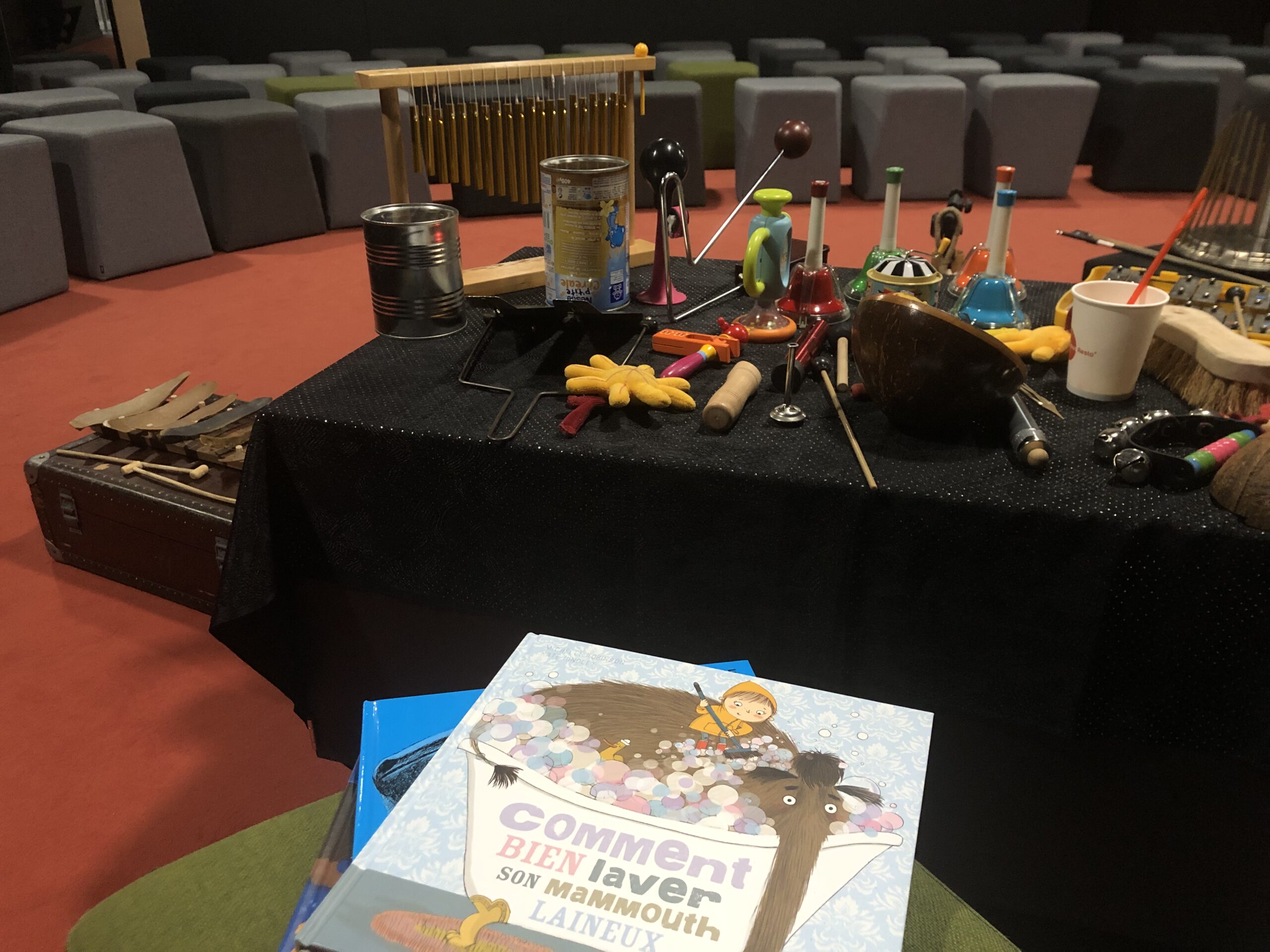 Une lecture bruitée, c’est un livre à la fois lu à voix haute et bruité en direct ! Au fur et à mesure des lectures, le public prend une part active dans la fabrication du son. Un jeu de carte et des instruments qui passent dans le public : qui piochera le bruit de l’orage ? Qui fera voler les oiseaux ? Les enfants et leurs parents manipulent des objets pour aider la bruiteuse dans son histoire !