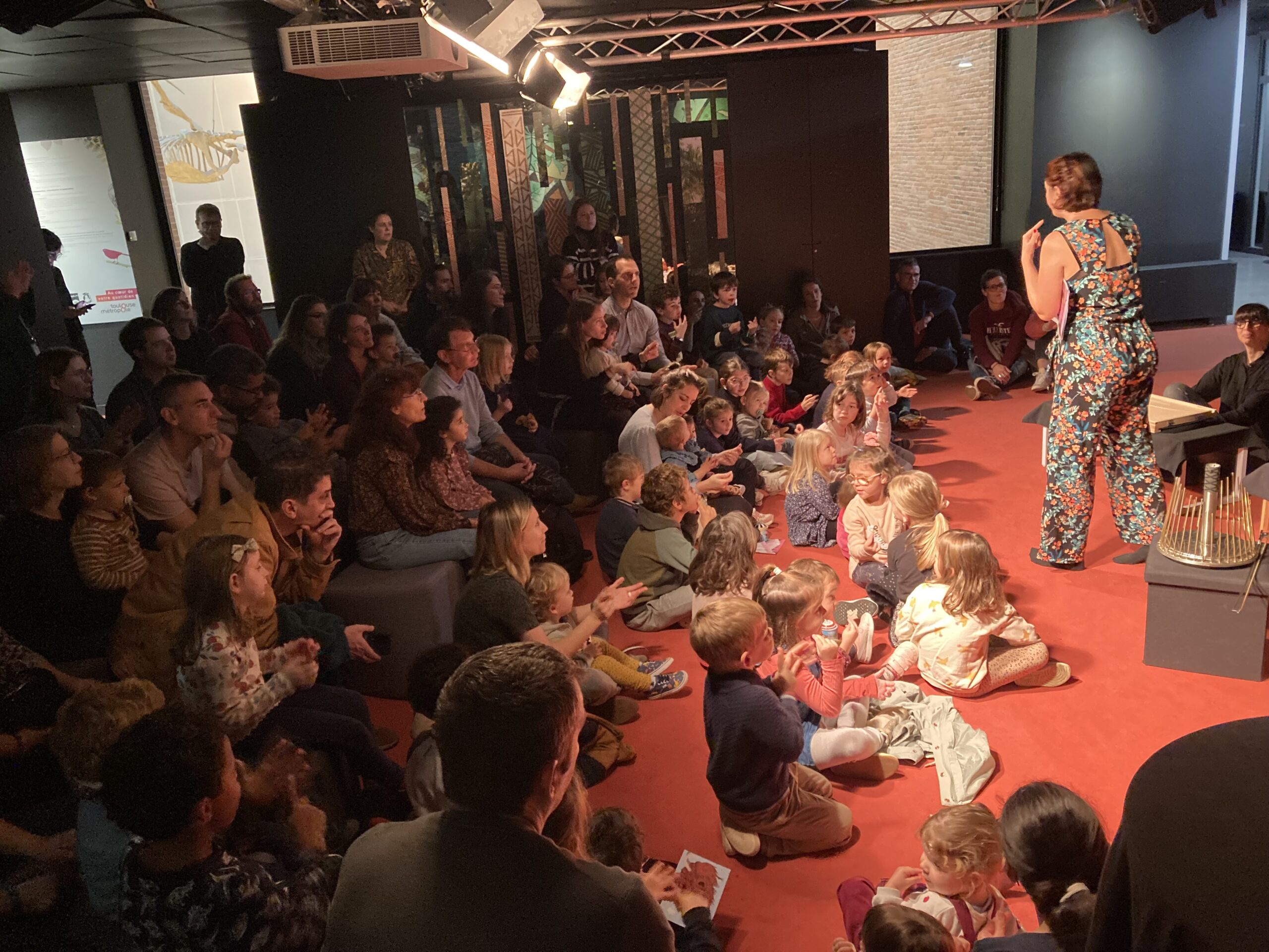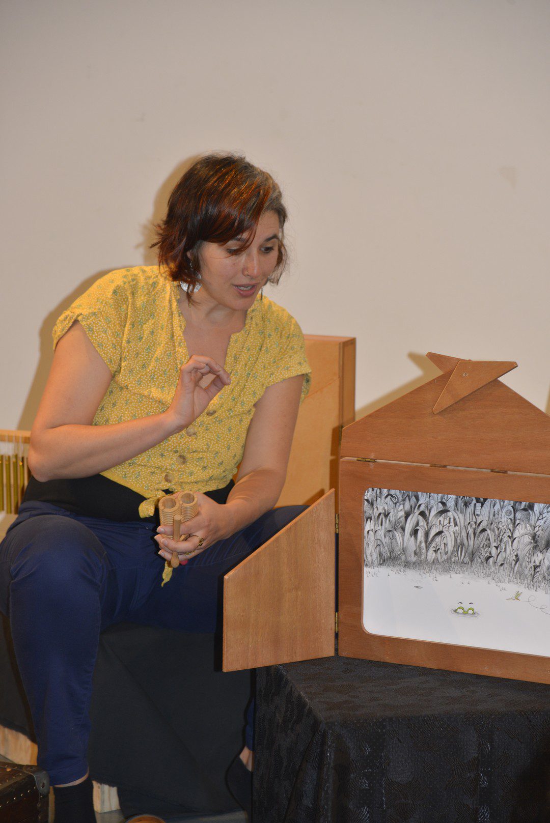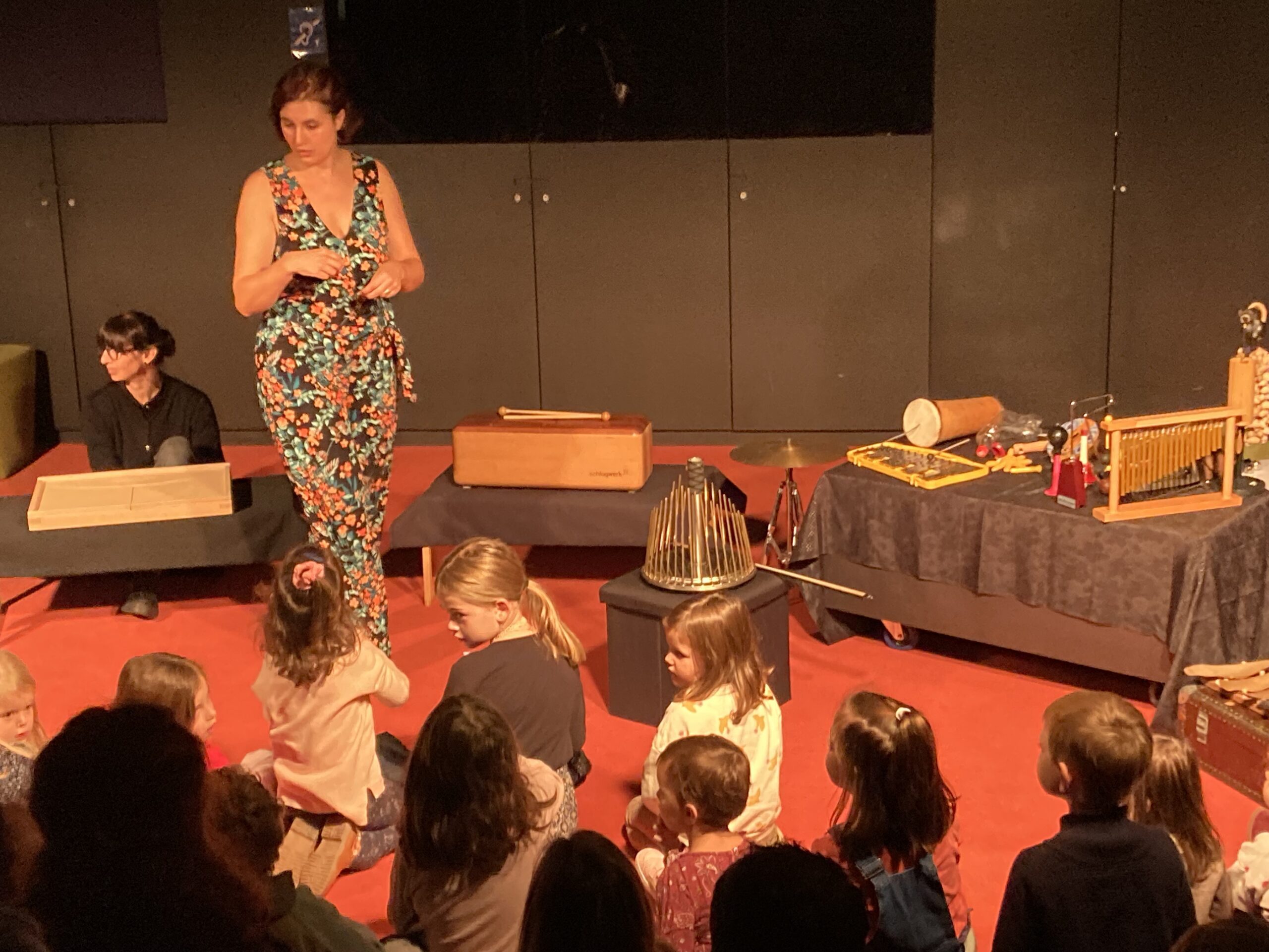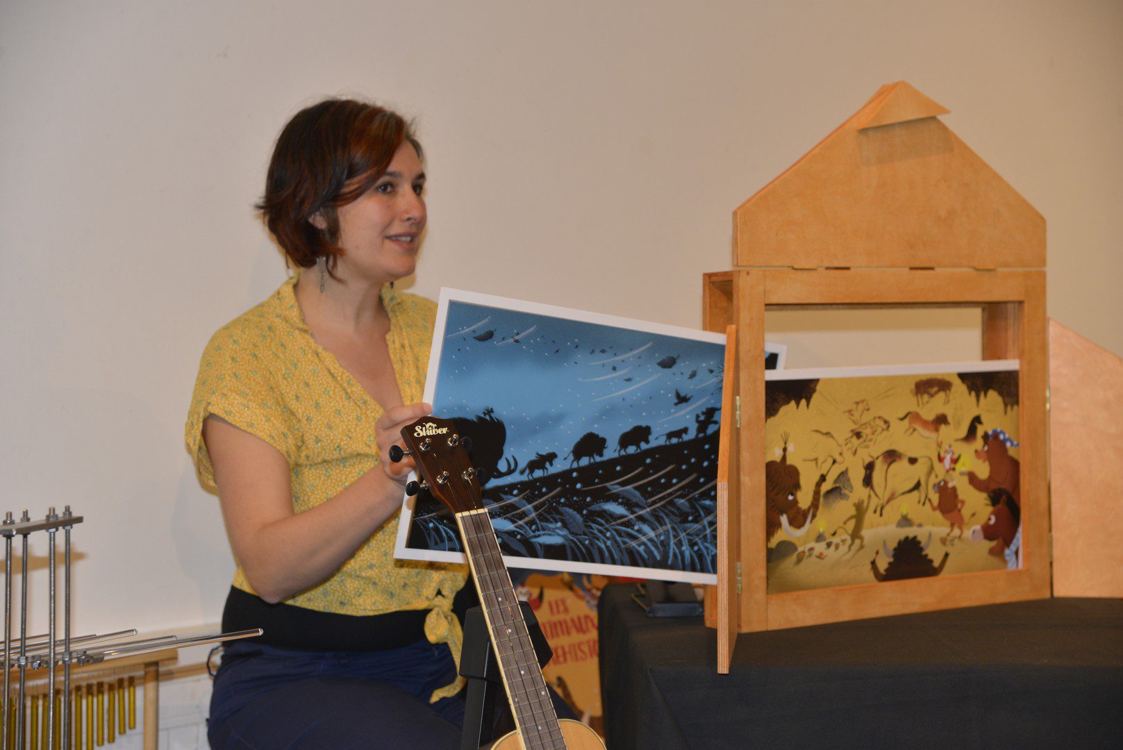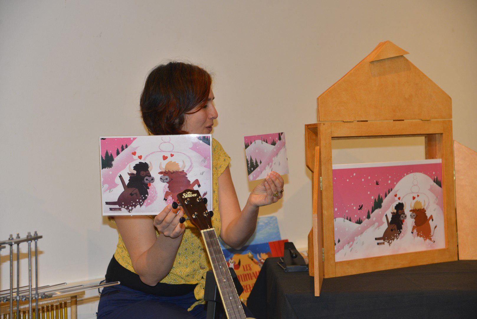 Une lecture bruitée, c’est un livre à la fois lu à voix haute et bruité en direct ! Au fur et à mesure des lectures, le public prend une part active dans la fabrication du son. Un jeu de carte et des instruments qui passent dans le public : qui piochera le bruit de l’orage ? Qui fera voler les oiseaux ? Les enfants et leurs parents manipulent des objets pour aider la bruiteuse dans son histoire !