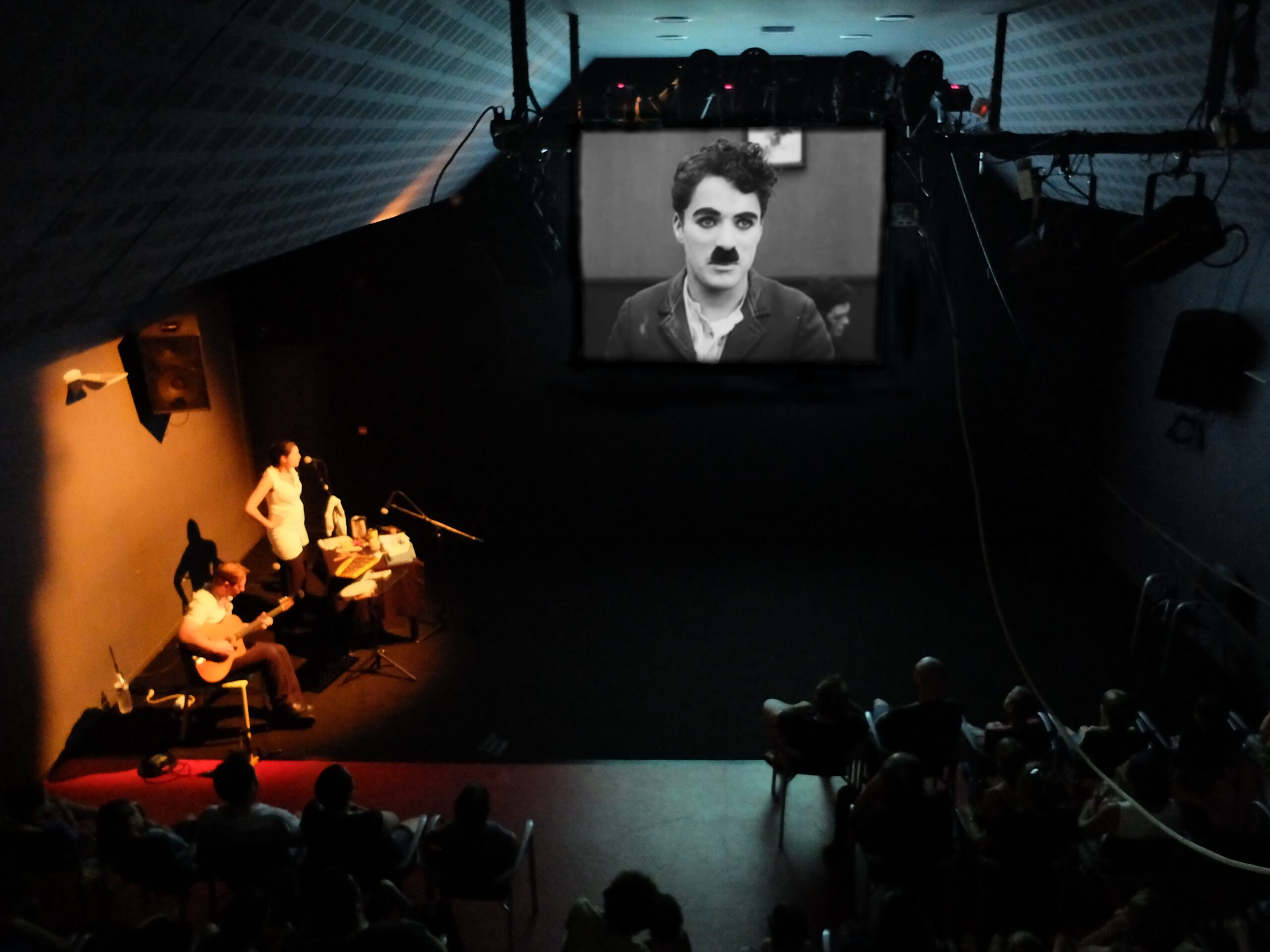 Un spectacle de bruitage qui ré-enchante un classique du cinéma muet : sur un court métrage de Chaplin, une bruiteuse et un pianiste accompagnent en direct les facéties de Charlot. A la musique swing du piano en direct s’ajoute une autre vie : les BING ! les PAF ! les PATATRAS ! Bref : le bruitage des gags est aussi en live !